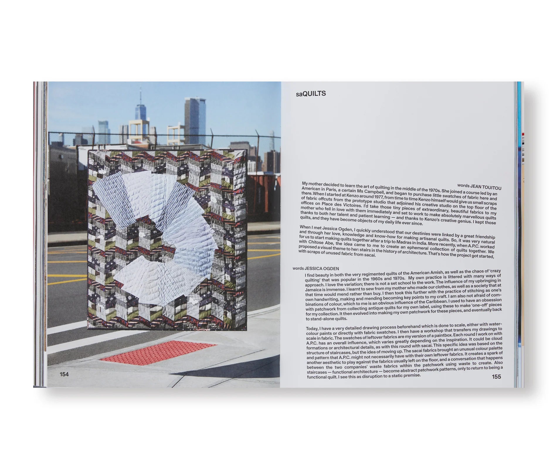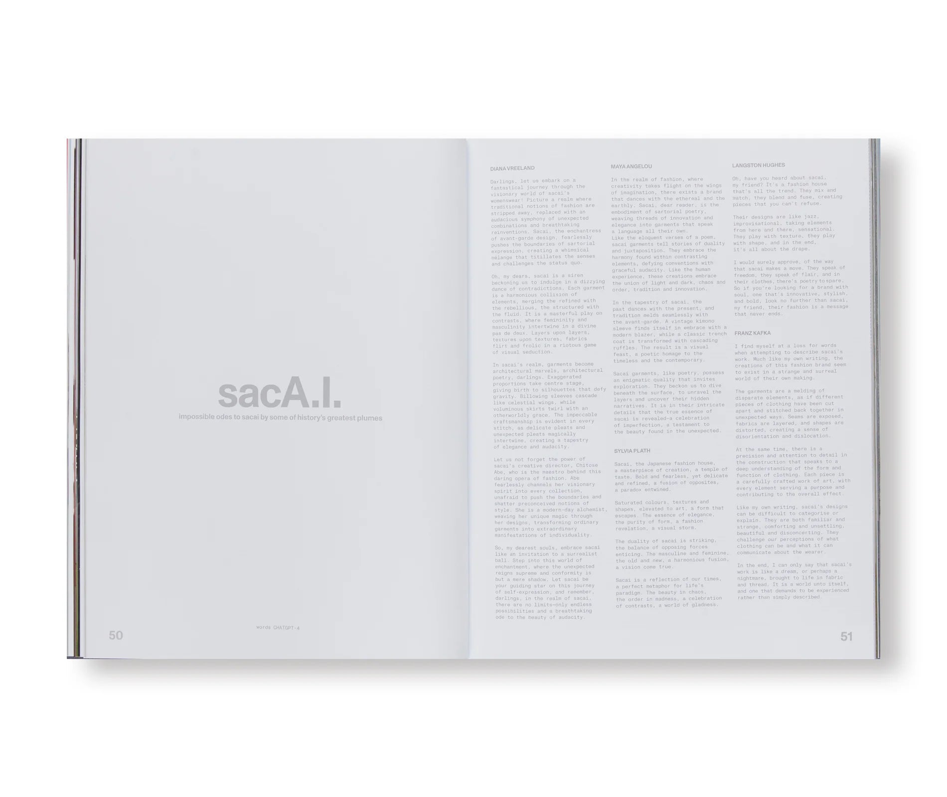 ウルトラマリンブルーが彩る先駆的なイメージを表現したカバーと、英語・日本語の両方でコンテンツを紹介する本誌は、 #sacaiTHEpeople を用いて東京からロサンゼルスまで国際色豊かに見せるポートレートシリーズから、シェフ、工業デザイナー、建築家、アーティスト、ライター、ビジネスアナリストによるコミッション・プロジェクトまで、sacai の背景にあるそのコミュニティとハイ・コンセプトの世界に迫る。ミニマリスト建築やアップサイクル工業デザインといった物質的な問題から、CGI製品やAI(人工知能)によるファッションルポといった無体の可能性まで、阿部は sacai のコラボレーション精神を、ハイブリッドや「安心と裏切り」というブランドの柱に様々な方法でアプローチする、きわめて現代的なドキュメントへと注ぎ込んでいる。