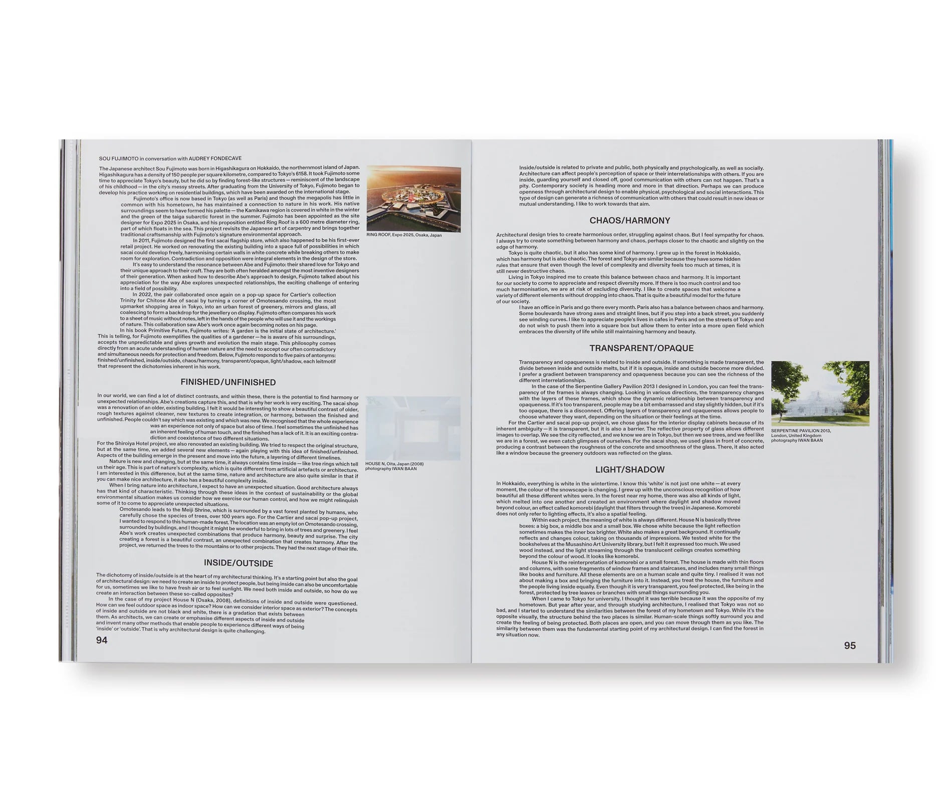 アート、建築の話題を中心とした東京発のインディペンデントマガジン『TOO MUCH Magazine』とのコラボレーションでは、sacai の旗艦店 sacai Aoyama の大規模な改装をそれぞれ手がけた日本の著名な建築家、藤本壮介と関祐介への詳細なインタビューを通じて、sacai と建築とのつながりを探る。
