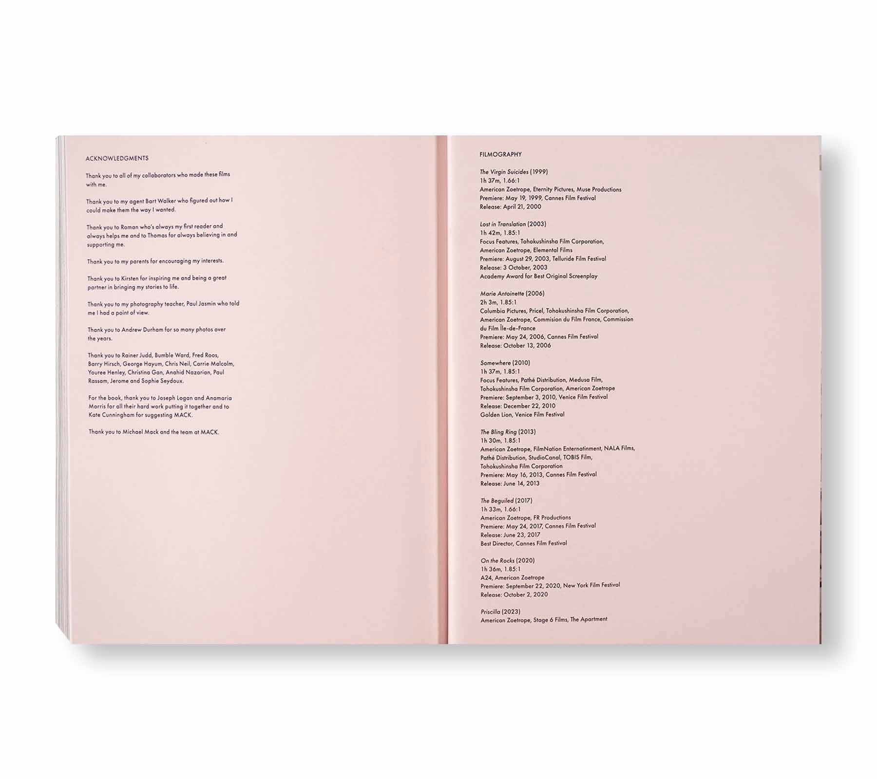 「ヴァージン・スーサイズ(英題:The Virgin Suicides)」(1999年)から「ロスト・イン・トランスレーション(英題:Lost in Translation)」(2003年)、「マリー・アントワネット(英題:Marie Antoinette)」(2006年)、「The Beguiled/ビガイルド 欲望のめざめ(英題:The Beguiled)」(2017年)、そしてエルビス・プレスリー(Elvis Presley)の妻プリシラ・プレスリー(Priscilla Presley)のグレースランドでの幼少時代を描いた最新作「プリシラ(英題:Priscilla)」(2023年秋公開予定)まで、21世紀を代表する紛れもない名作の数々の舞台裏を垣間見ることができる、満足感の高い1冊に仕上がっている。
