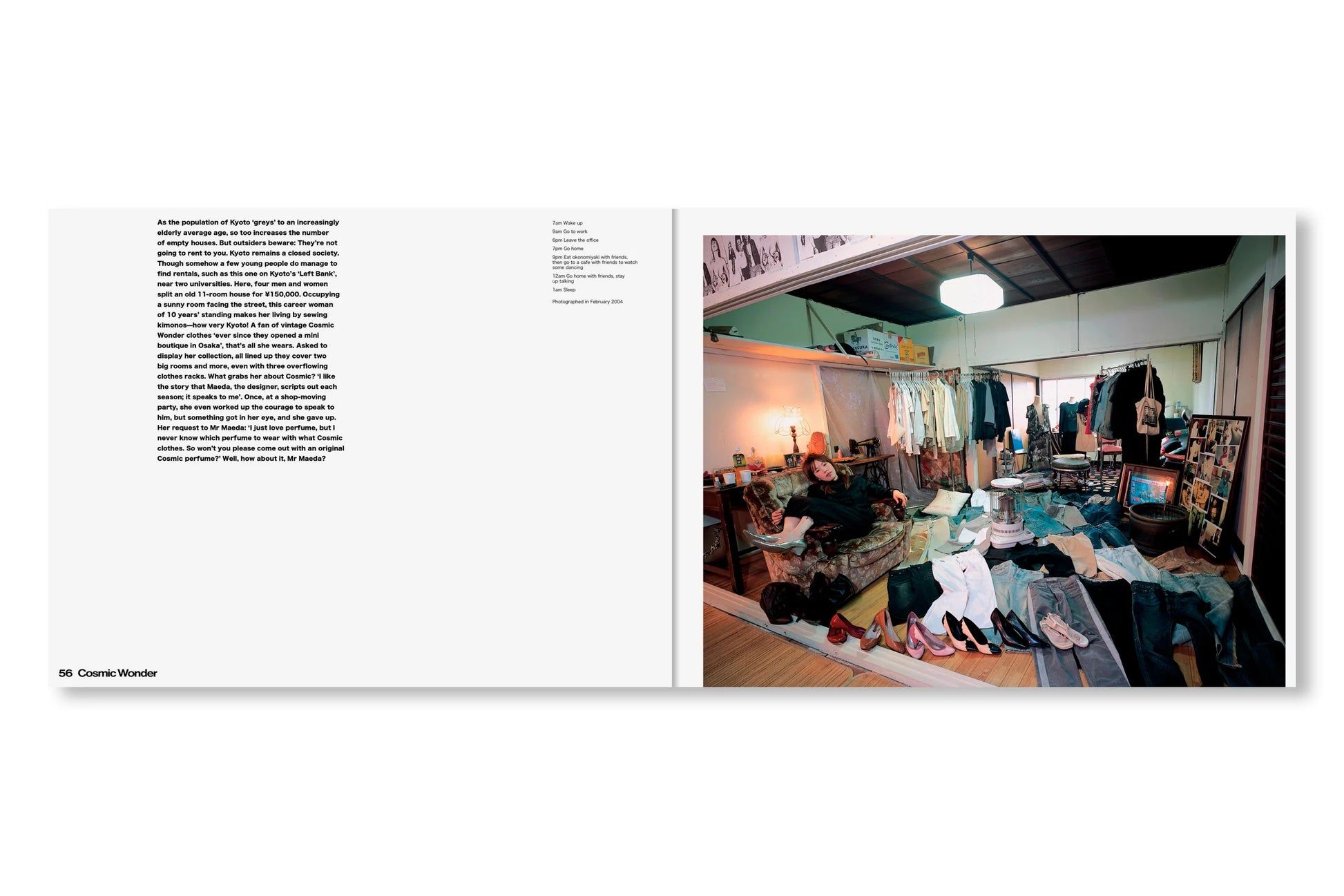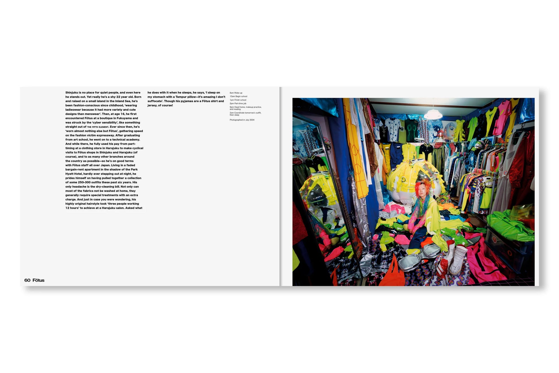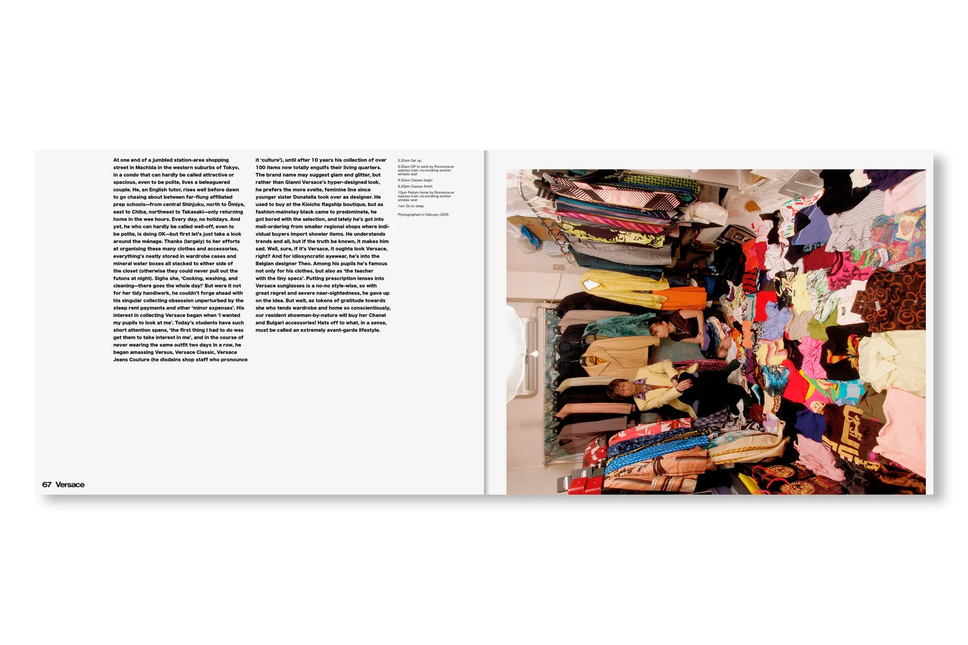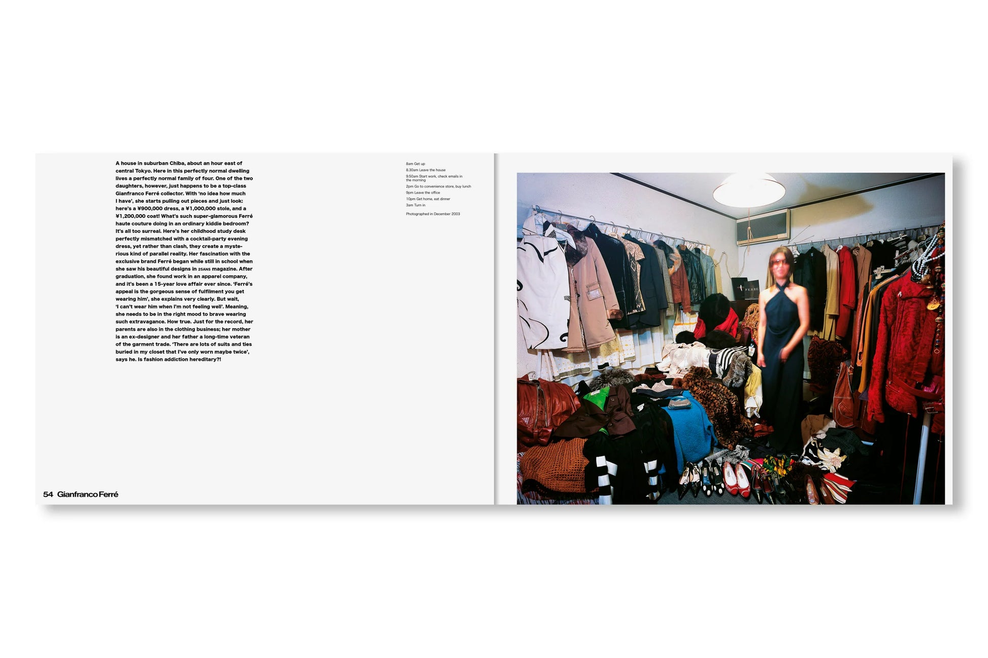 表紙と帯はすっかりリニューアルしたが、内容はオリジナル版から引き継がれたシンプルなドキュメンタリーのフォーマットが保たれている。見開きページひとつにつきひとりの「幸福な犠牲者(happy victim)」が登場し、作者が撮影した部屋の写真それぞれに、その人物に関する短い解説と、典型的な一日のスケジュールが添えられている。その多くは富裕層ですらないから、彼らは毎日仕事場と家を往復し、その合間に服の手入れをする時間を見つけなければならない。本書の全編に漂う共感や親近感からは、同時に「このプロジェクトをいま再現することの困難さ」も滲み出す。SNS上であらゆるストーリーが大規模に生み出され消費され消し去られながら、ファッション産業そのものが限りなく断片化され、拡散した文化現象となりつつある現在。そしてファスト・ファッションとストリート・レベル、両方のトレンドにハイファッションが本来の場を奪われつつある現在においては。