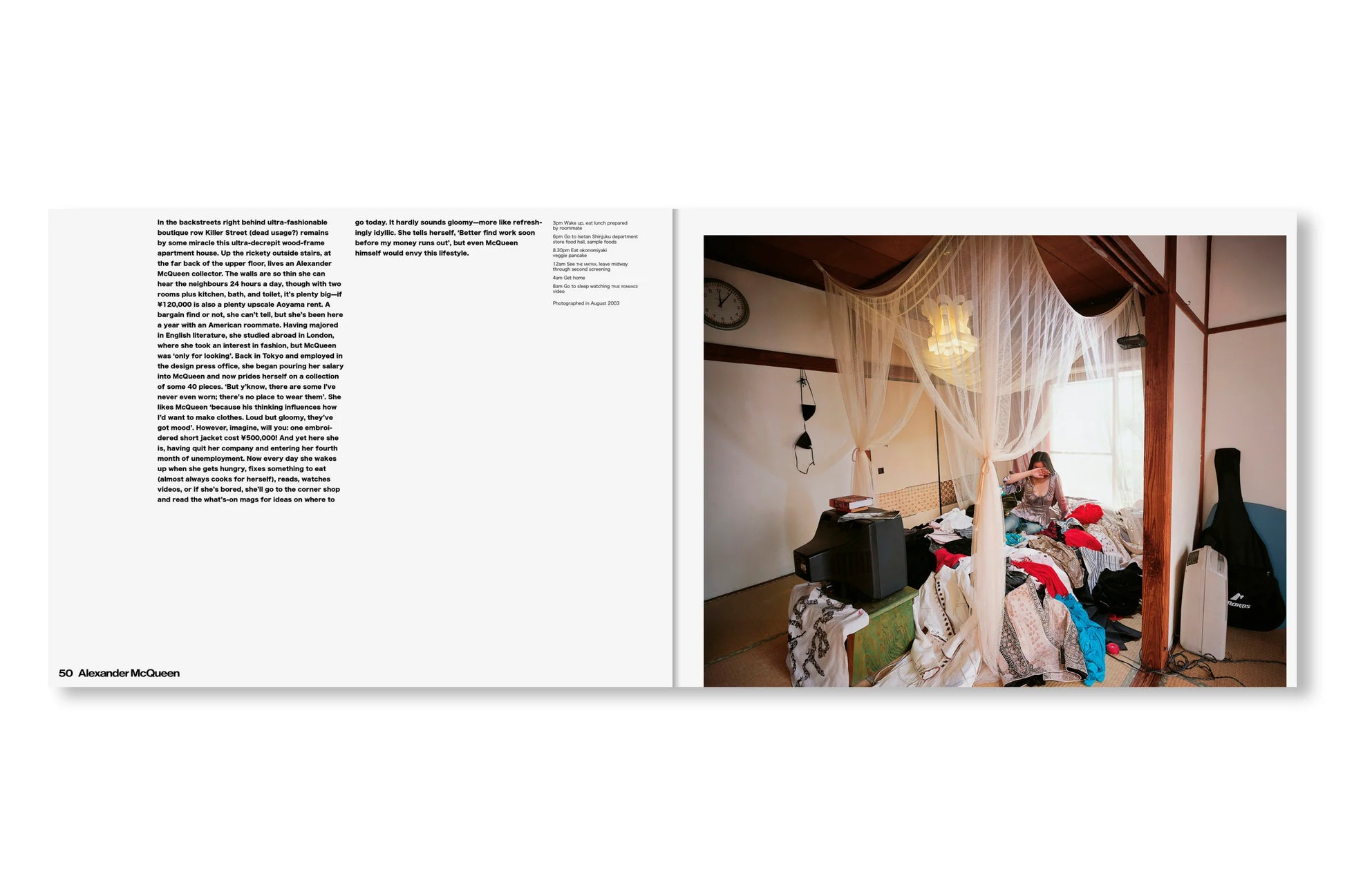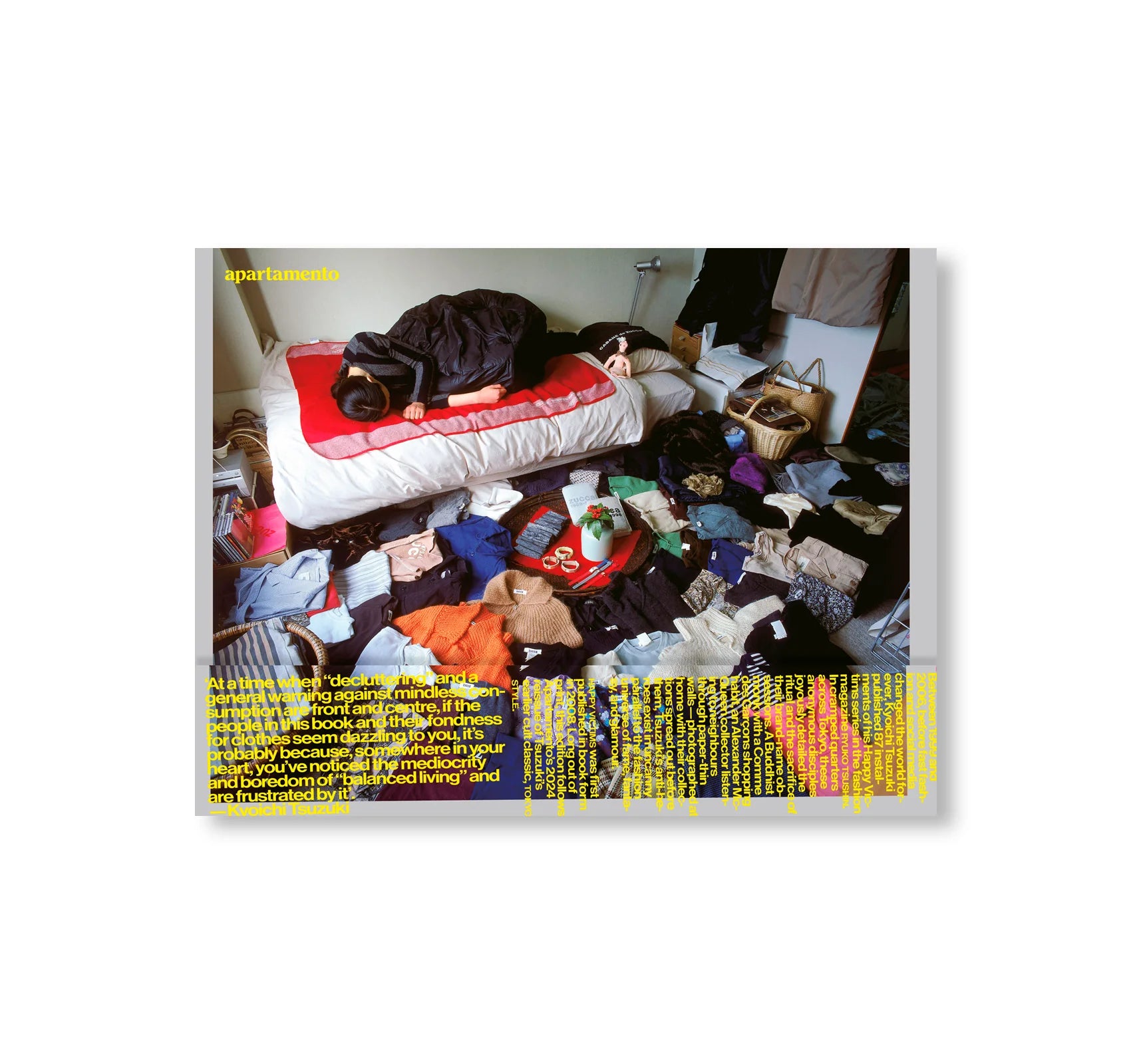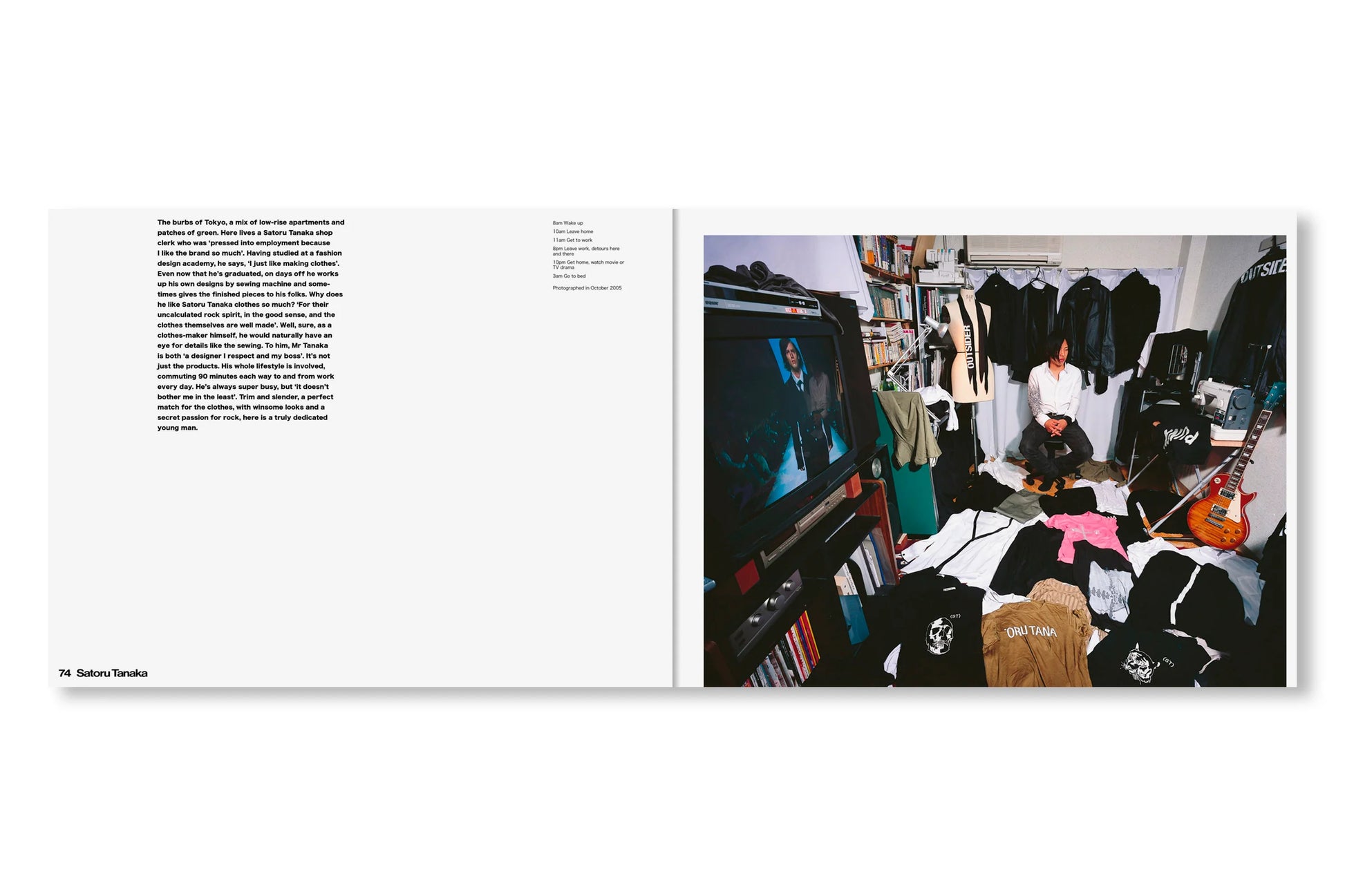 表紙と帯はすっかりリニューアルしたが、内容はオリジナル版から引き継がれたシンプルなドキュメンタリーのフォーマットが保たれている。見開きページひとつにつきひとりの「幸福な犠牲者(happy victim)」が登場し、作者が撮影した部屋の写真それぞれに、その人物に関する短い解説と、典型的な一日のスケジュールが添えられている。その多くは富裕層ですらないから、彼らは毎日仕事場と家を往復し、その合間に服の手入れをする時間を見つけなければならない。本書の全編に漂う共感や親近感からは、同時に「このプロジェクトをいま再現することの困難さ」も滲み出す。SNS上であらゆるストーリーが大規模に生み出され消費され消し去られながら、ファッション産業そのものが限りなく断片化され、拡散した文化現象となりつつある現在。そしてファスト・ファッションとストリート・レベル、両方のトレンドにハイファッションが本来の場を奪われつつある現在においては。