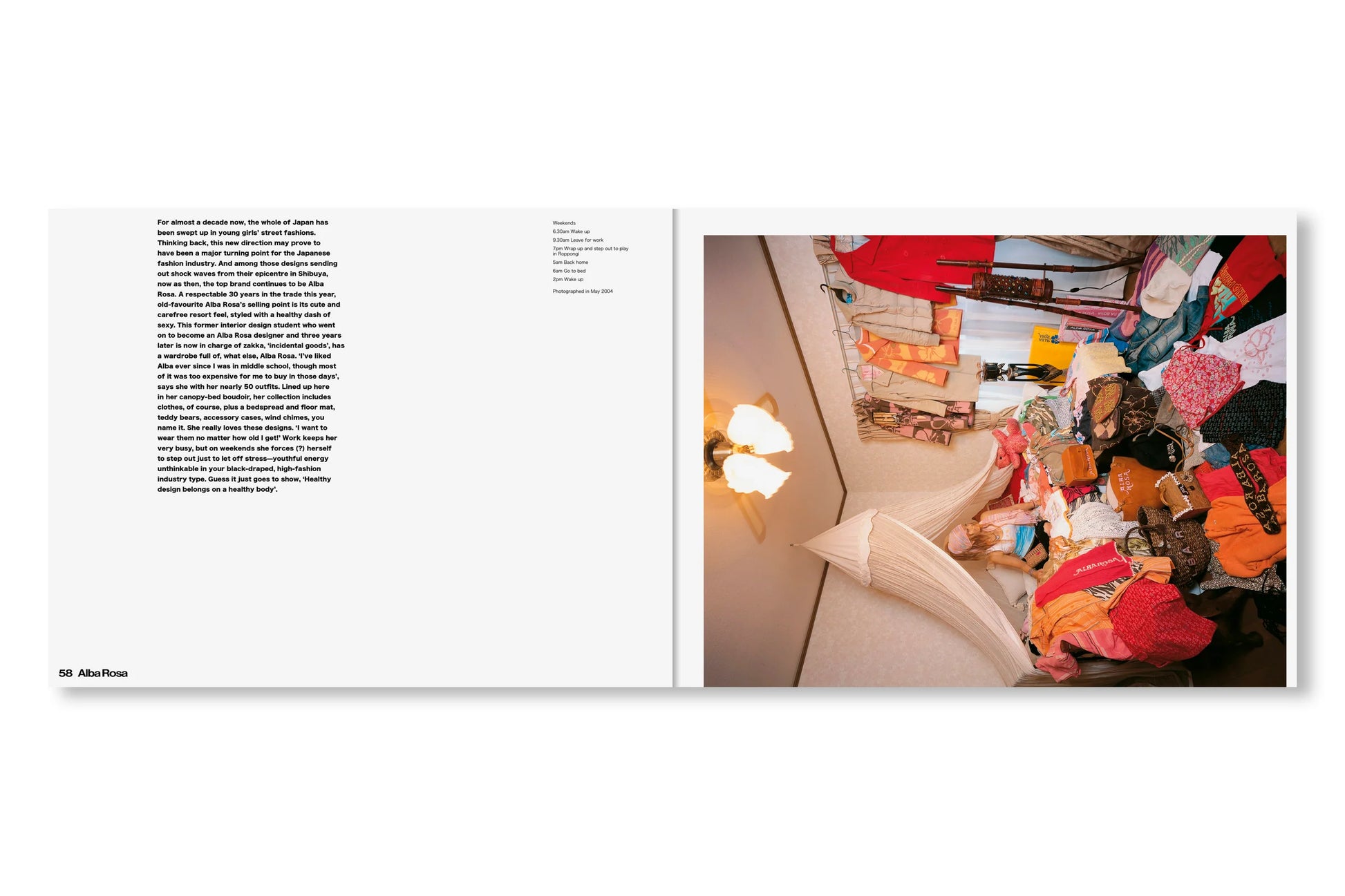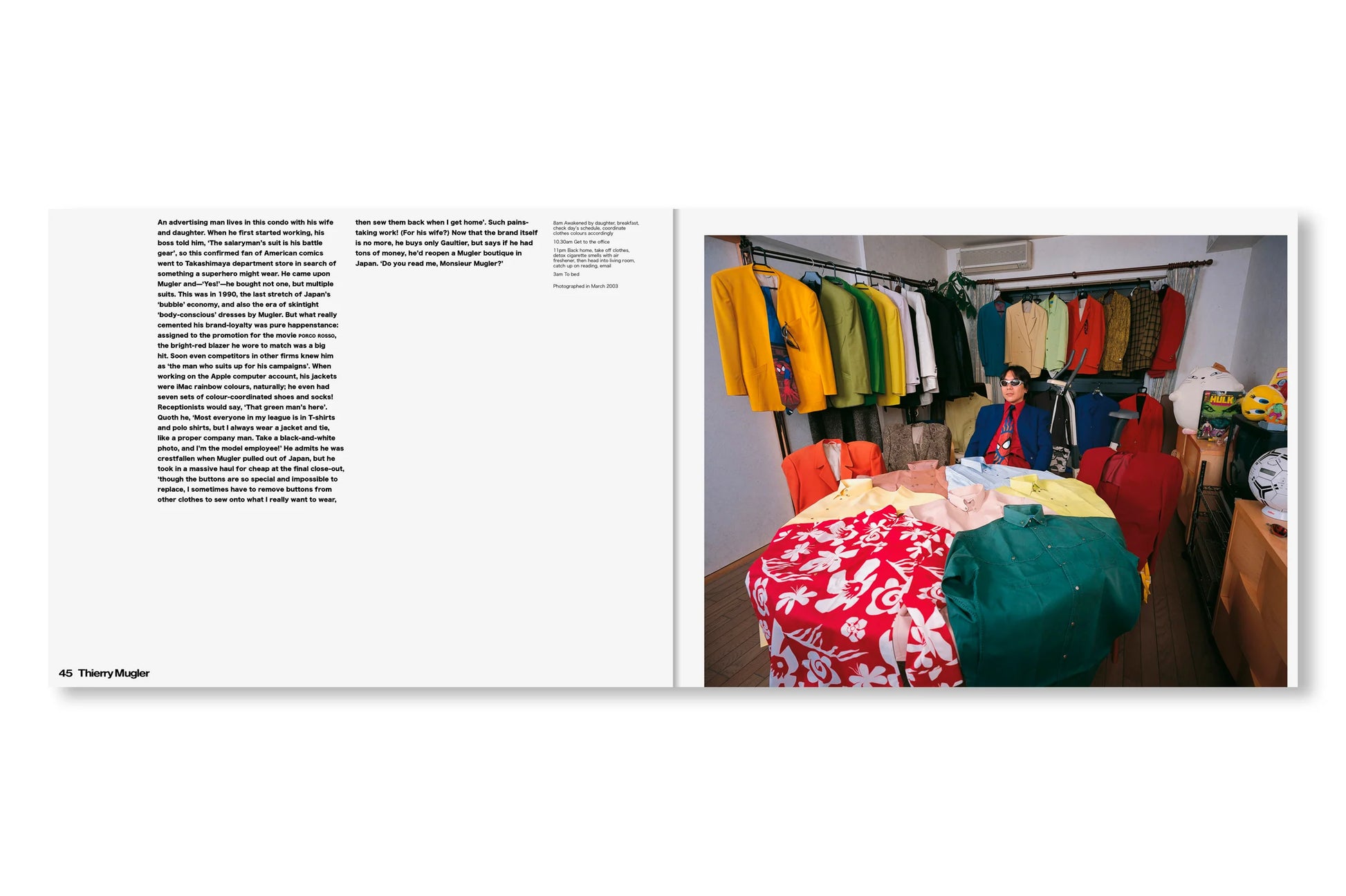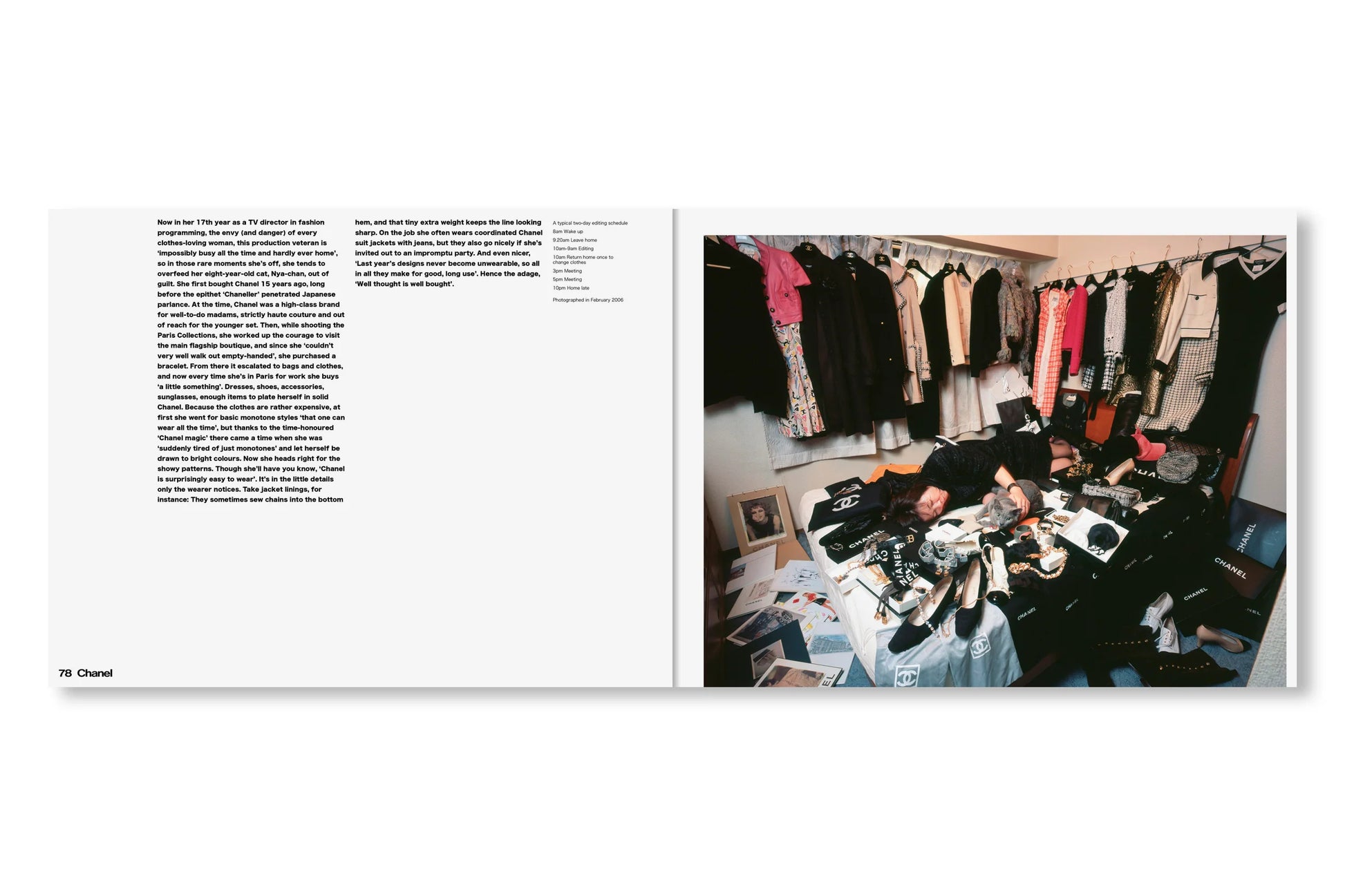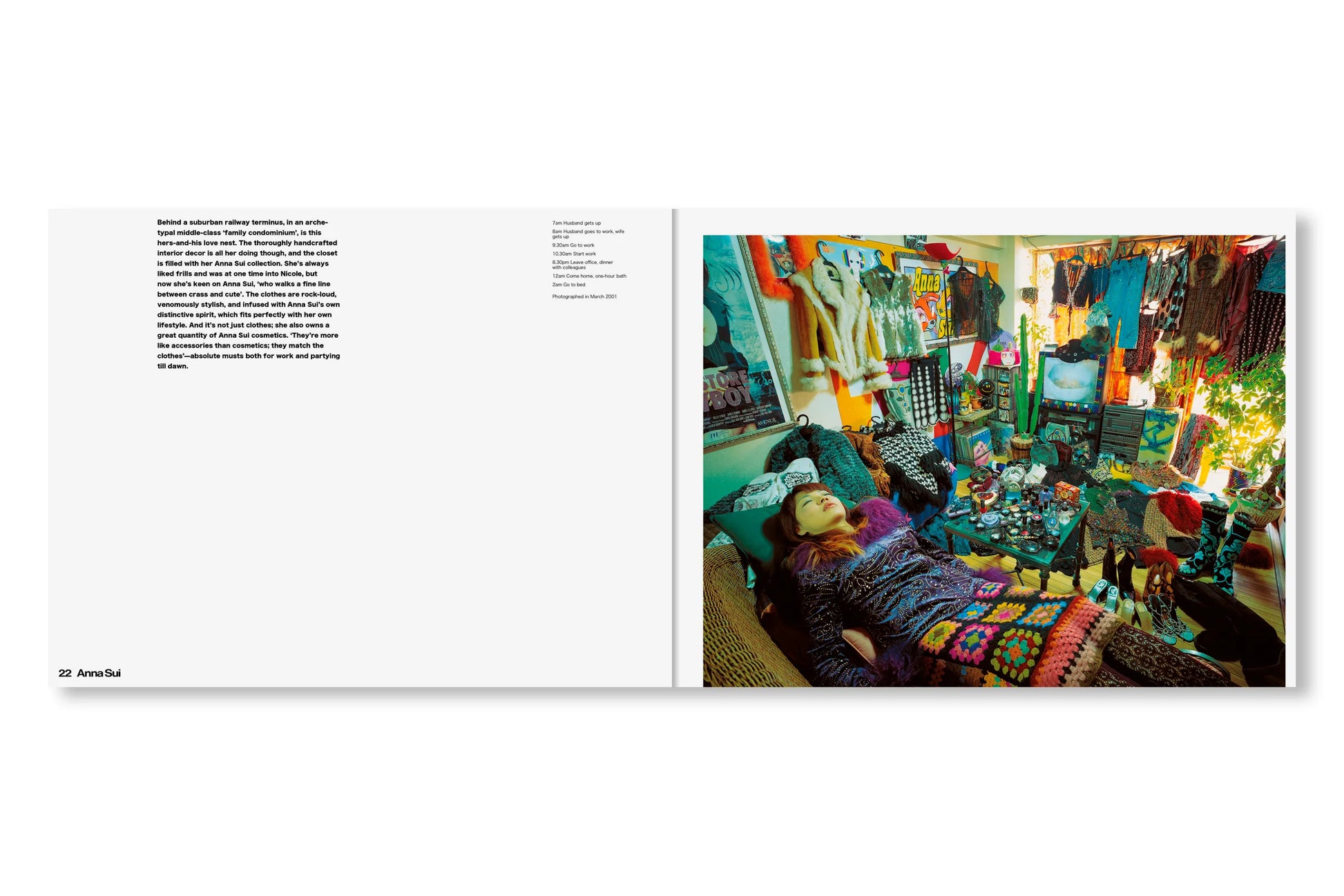 表紙と帯はすっかりリニューアルしたが、内容はオリジナル版から引き継がれたシンプルなドキュメンタリーのフォーマットが保たれている。見開きページひとつにつきひとりの「幸福な犠牲者(happy victim)」が登場し、作者が撮影した部屋の写真それぞれに、その人物に関する短い解説と、典型的な一日のスケジュールが添えられている。その多くは富裕層ですらないから、彼らは毎日仕事場と家を往復し、その合間に服の手入れをする時間を見つけなければならない。本書の全編に漂う共感や親近感からは、同時に「このプロジェクトをいま再現することの困難さ」も滲み出す。SNS上であらゆるストーリーが大規模に生み出され消費され消し去られながら、ファッション産業そのものが限りなく断片化され、拡散した文化現象となりつつある現在。そしてファスト・ファッションとストリート・レベル、両方のトレンドにハイファッションが本来の場を奪われつつある現在においては。