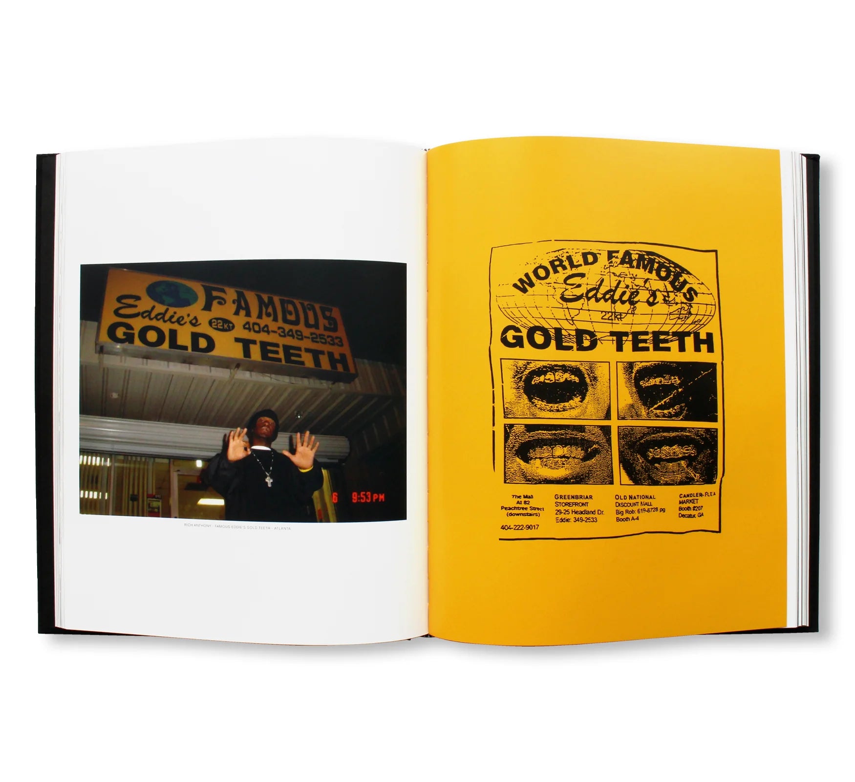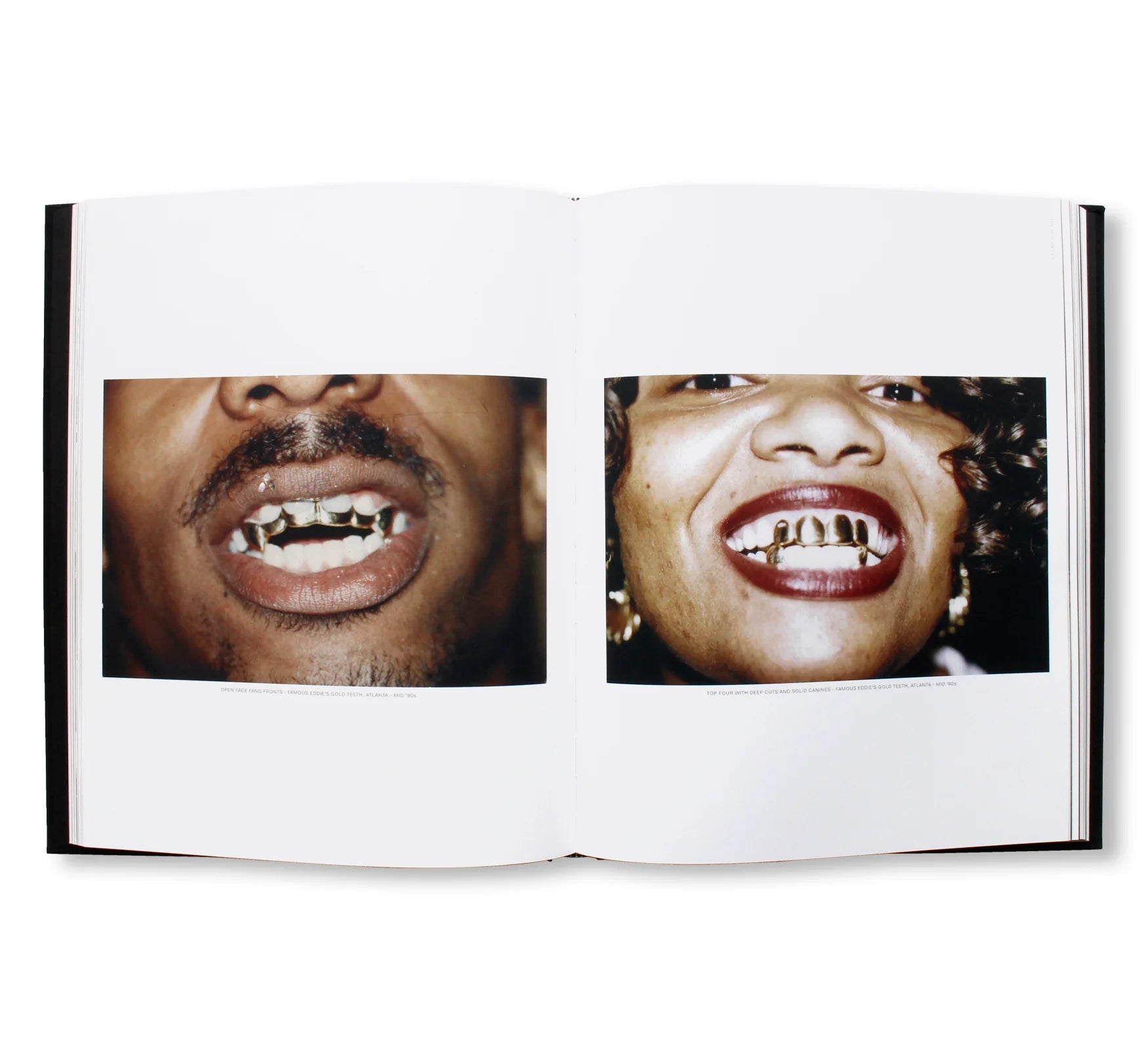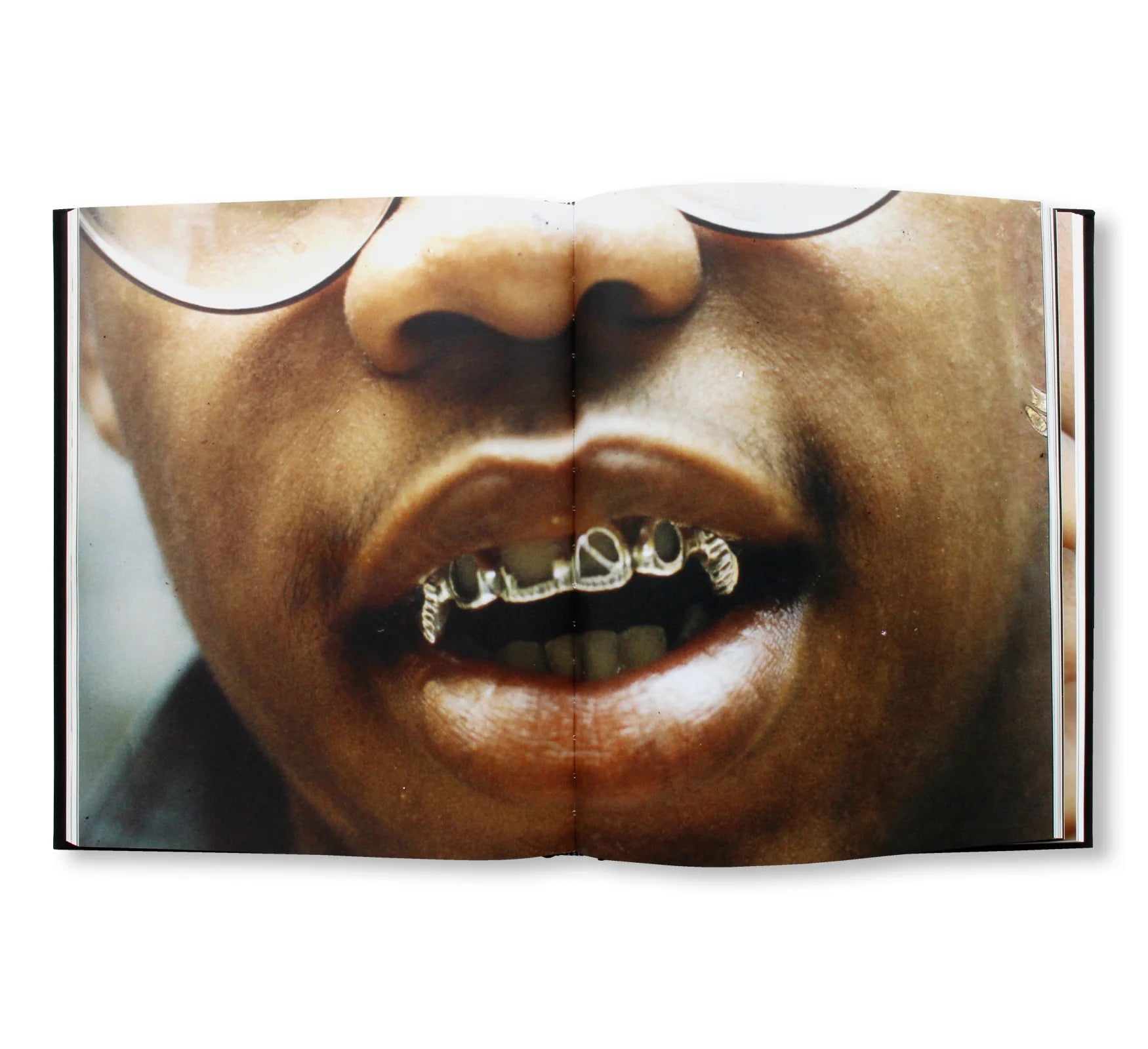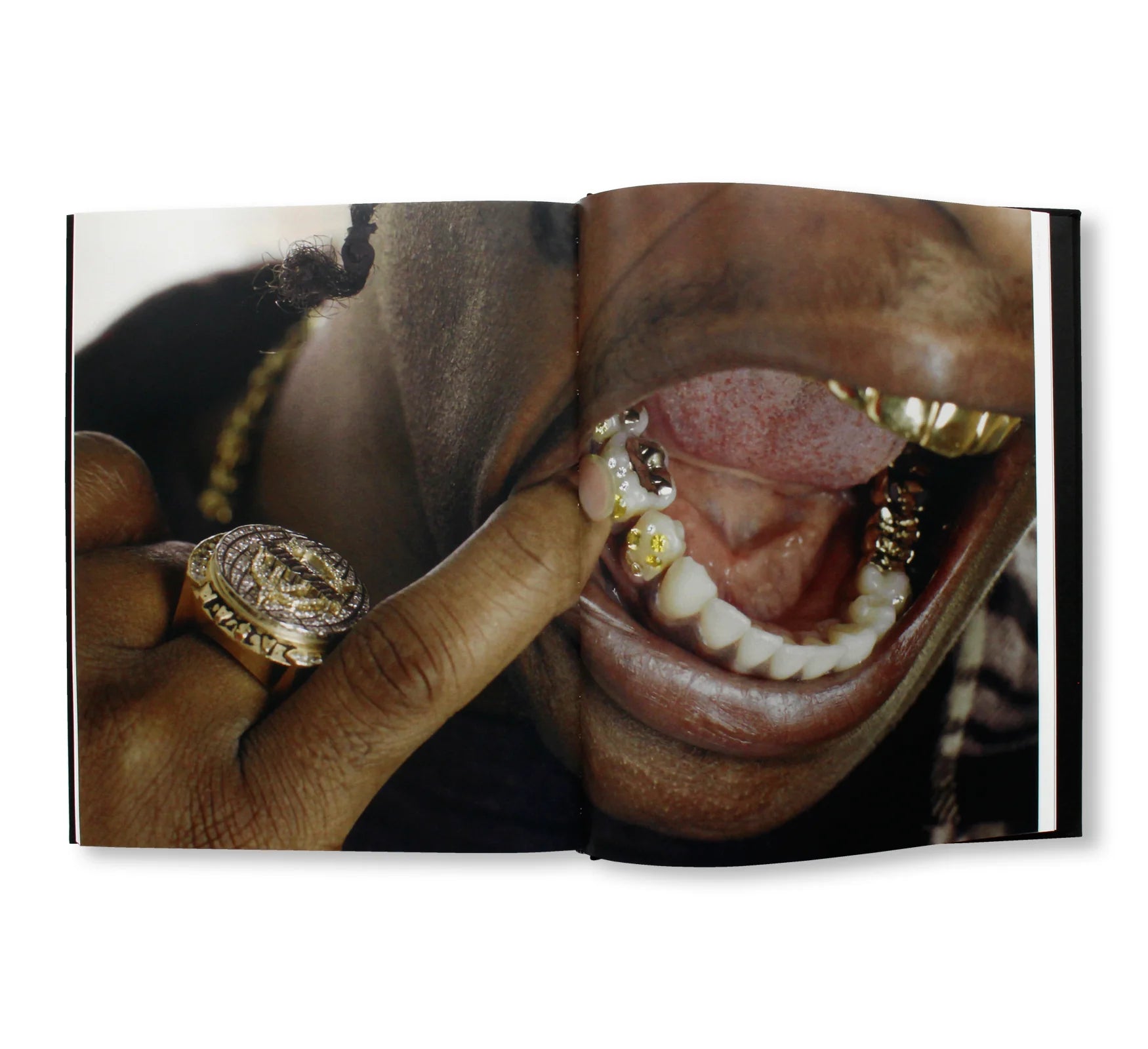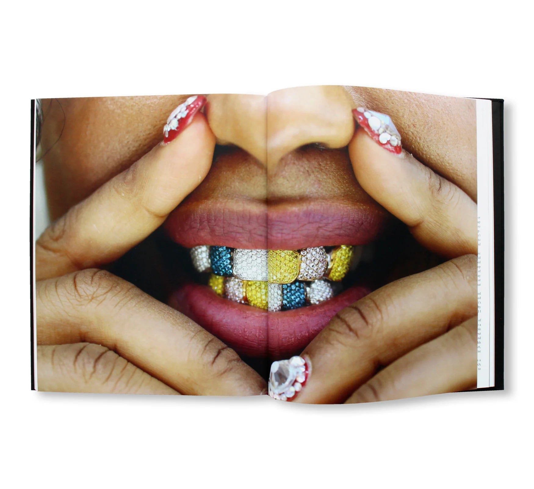 アトランタの「フェイマス・エディーズ・ゴールド・ティース(Famous Eddie’s Gold Teeth)」の看板の前で撮られた一枚、当時のヒップホップ界の功労者は皆揃って客であった、NYを拠点に活動するグラフィティアーティスト「シャツキングフェイド(Shirt King Phade)」とドーン(Dawn)が写る一枚、ギャビー・イーラン・ジュエリー(Gabby Elan Jewelry)によるデザインが施されたグリルズ「Exotica」、タイラー・ザ・クリエイター(Tyler, The Creator)の下歯、本書の至る所に現れる「この世の奇才」ナズ(Nas)とケリス(Kelis)が写る一枚。これらのイメージで語る視覚的情報、テキストで綴られる鮮やかな物語など、本書にはその世界のすべてが揃っている。
