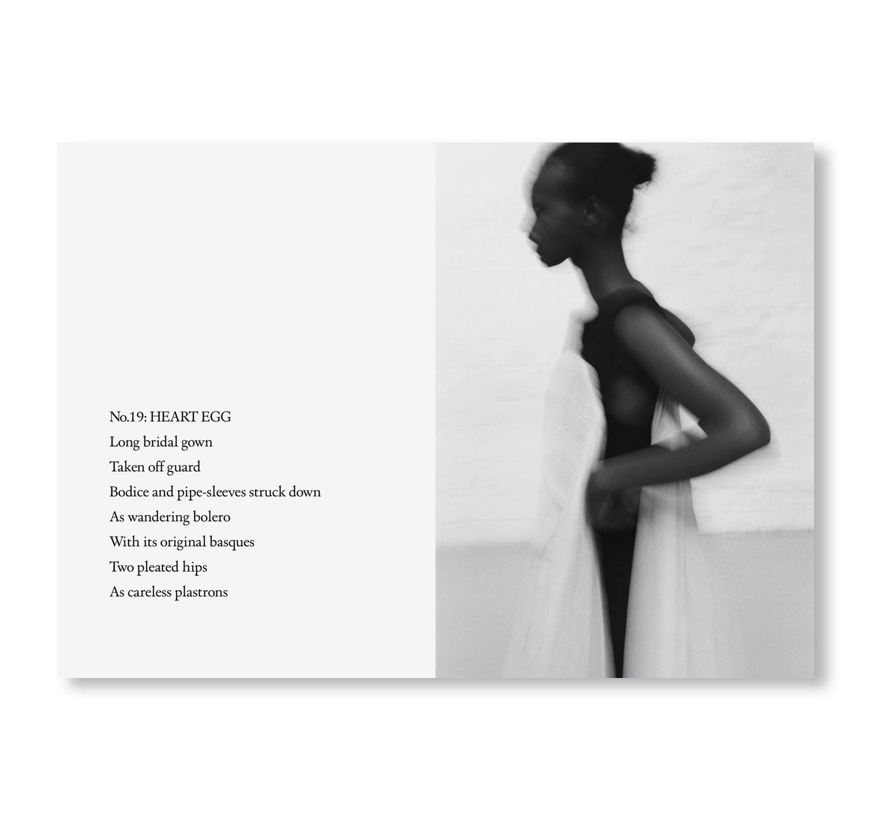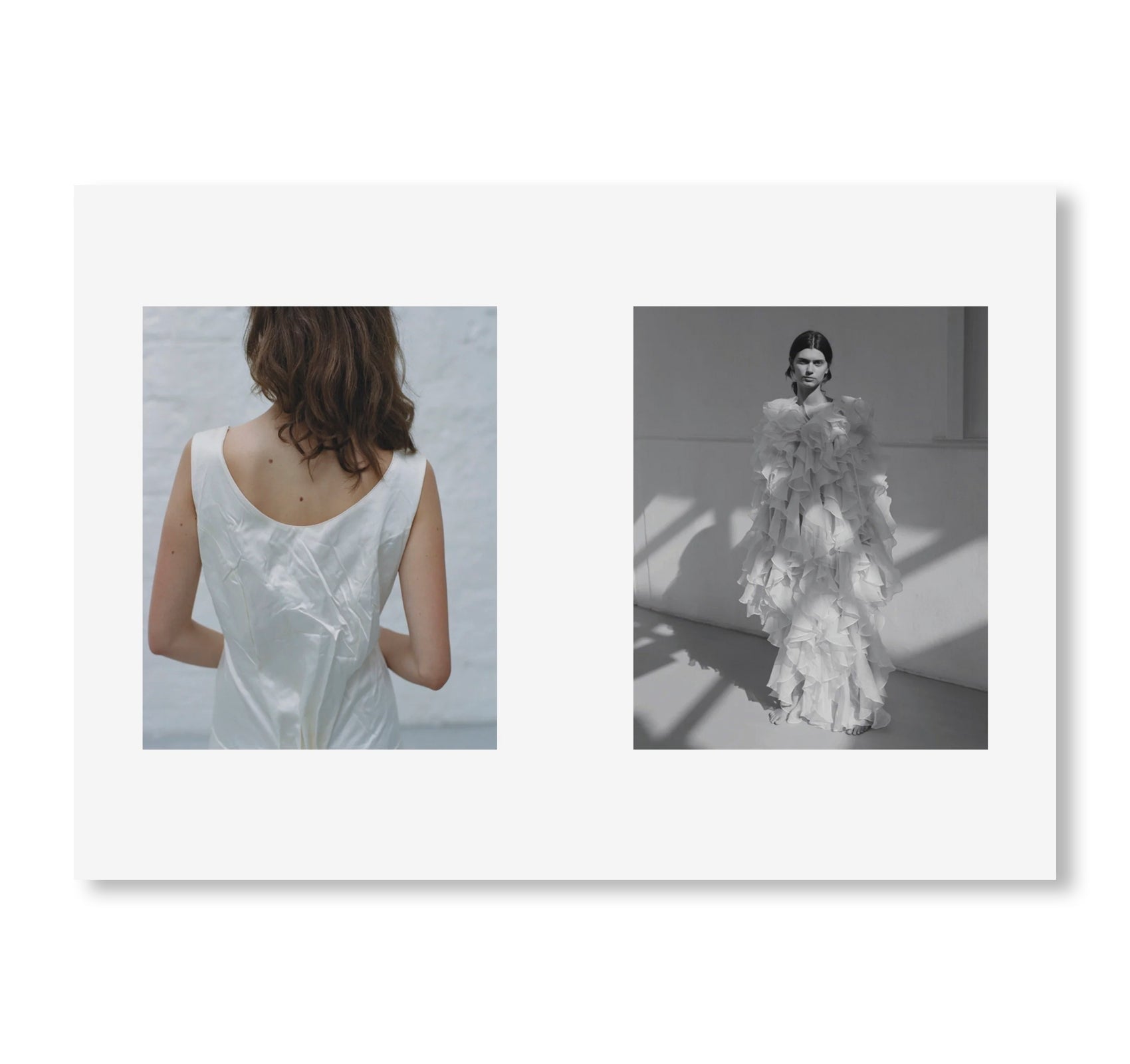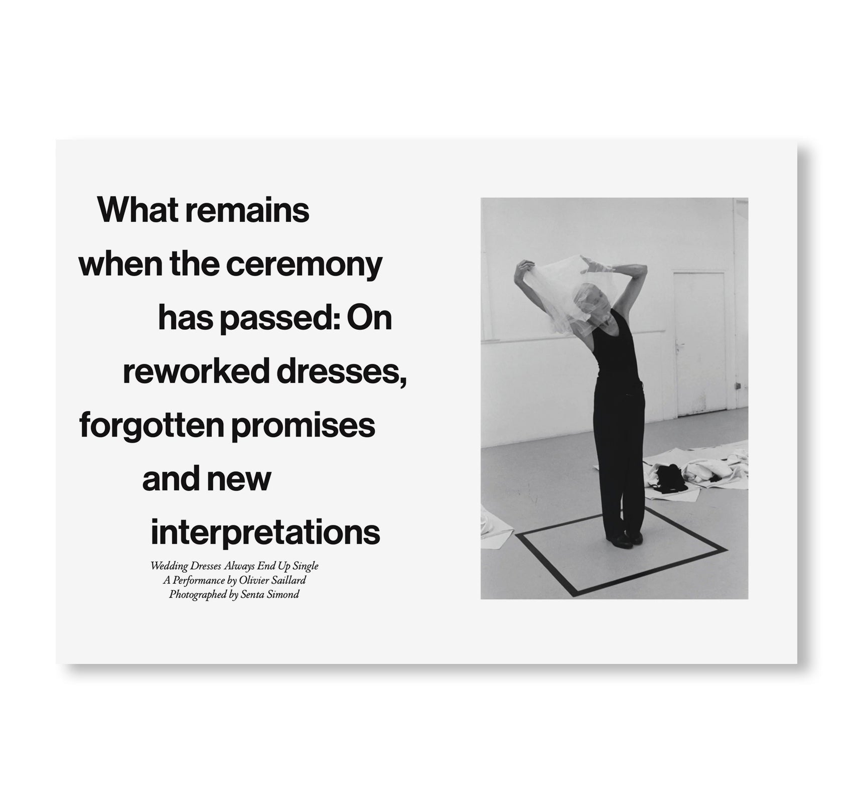 本号のために、スイス人フォトグラファー、センタ・サイモンド(Senta Simond)がその舞台に入り、モーダ・ポーヴェラの《Wedding Dresses Always End Up Single》第27章を記録した。オンラインや寄付回収ボックスで集めた中古のウエディングドレスから構成されたパフォーマンスであり、引き裂かれ、縫い合わせられたドレスはノスタルジーを拒むようでもある。パリでおこなわれた本撮影には、オリジナルのパフォーマーであり、長年のコラボレーターであるアクセル・ドゥエ(Axelle Doué)に加え、サイモンドが選んだ若いモデル2名が参加。新たな顔ぶれが、ドレスに別の命を宿し、パフォーマンスの外へ押し広げた。
